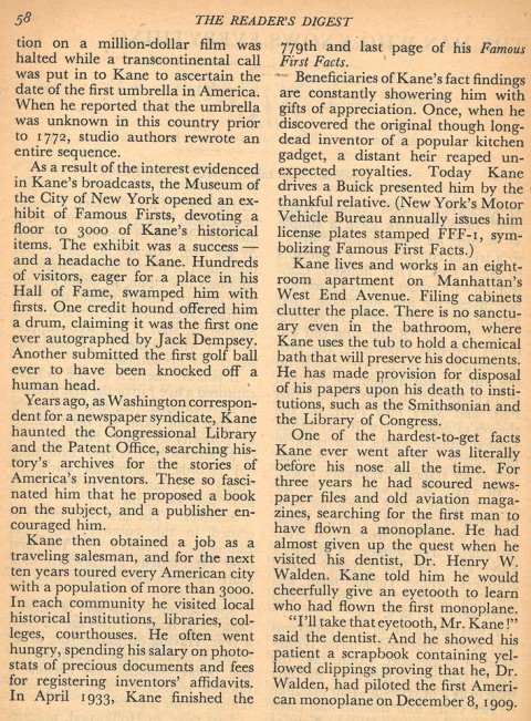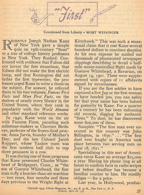 Joseph Nathan Kane did a radio show and wrote a book called "Famous First Facts". It was widely popular. For one radio show, he invited Gustave Whitehead's son, Charles, to tell the world about his father's 1901 flight. Kane did further research and became convinced Whitehead had performed history's first powered, sustained, controlled, heaver-than-air, manned flight. He put Whitehead's achievement in his book of "Firsts" and wrote an article about him for Liberty Magazine. That article was then condensed into a shorter article which appeared in Reader's Digest in July, 1945. Here's an excerpt from the text:
