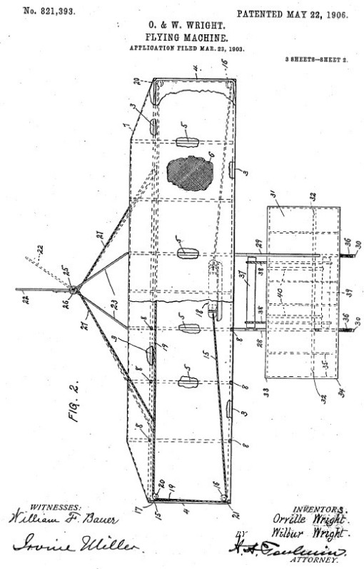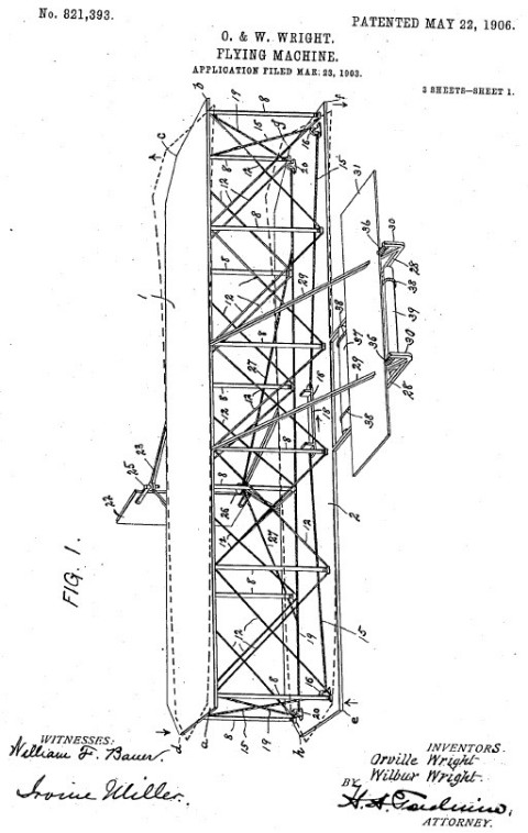 In the Wright brothers' patent, below & here: http://worldwide.espacenet.com/publicationDetails/originalDocument?CC=US&NR=821393A&KC=A&FT=D&ND=3&date=19060522&DB=EPODOC&locale=en_EP neither in the drawings nor in the claims section is there a reference to powered flight.