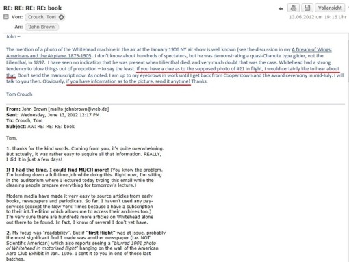 John's immediate reaction was to propose a joint book co-authored by himself and Tom. Tom wrote back that he was "seriously considering" the proposal but ultimately declined. Again, without needing to, Tom twice goaded John to come up with the photo of Whitehead in flight (see Email below). However, unbeknown to Tom, by that time John already had the photo. He also had indictions, Tom had known of its existence several years beforehand.