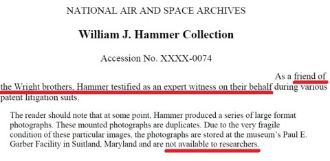 The Hammer Collection is in the posession of the National Air and Space archives of The Smithsonian Institute. The quality of the photos and the fact William J. Hammer was a close friend of the Wrights make it a valued treasure. Ab excerpt of The Smithsonian's description of the Collection's contents can be seen below: