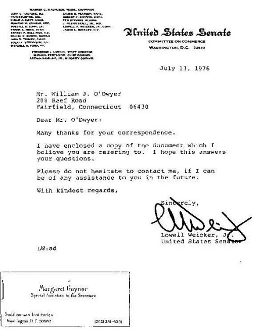 US Sen. Lowell Weicker Jr. to W.J.O’Dwyer, July 13, 1976