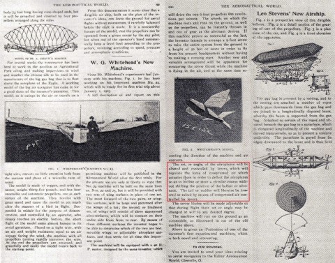 Whitehead himself wrote in "Aeronautical World" an accurate description of the pneumatically-powered wing-warping steering mechanism in his new aircraft (see excerpt below):