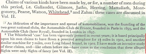 Abgesehen davon, dass niemand die Wrights bei einer absichtlichen Unwahrheit etappt hat, dürfte die Unterstellung, die Wrights hätten irgendwelche wertvollen Informationen von Whitehead erhalten, zu den groteskensten Behauptungen in der Geschichte der Luftfahrt gehören."