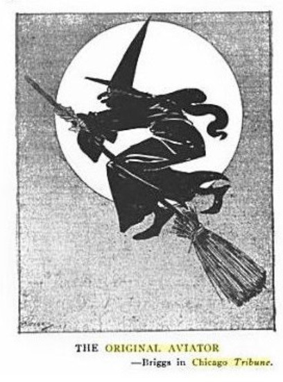 The illustration of a witch - shown below - also headed a 1908 article in the Chicago Tribune describing flights by Glenn Curtiss in France.
