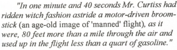 Some months previously, the Associated Press used the "witch-on-a-broomstick" analogy to describe what is often referred to as the first "official*" powered flight in North America by Glenn Curtiss (*the first to be witnessed and measured by officials of an aviation organisation).