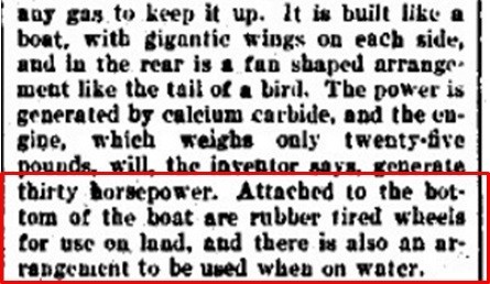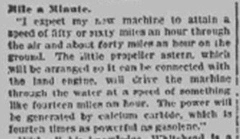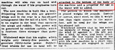 „… at the first trial it covered nearly two miles over the water of Long Island Sound and settled in the water without mishap to either machine or operator. It was then towed back to the starting place. On the second trial it started from the same place and sailed with myself on board across Long Island Sound. The machine kept on steadily in crossing the wind at a height of about 200 feet , when it came into my mind to try steering around in a circle. As soon as I turned the rudder and drove one propeller faster than the other the machine turned a bend and flew north with the wind at a frightful speed, but turned steadily around until I saw the starting place in the distance. I continued to turn, but when near the land again, I slowed up the propellers and sank gently down on an even keel into the water, she readily floating like a boat. My men then pulled her out of the water…”