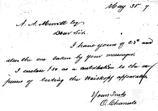"...Chanute once again exhibited his generosity by donating $50 to the expenses involved in constructing and testing the "Weisskopf apparatus".