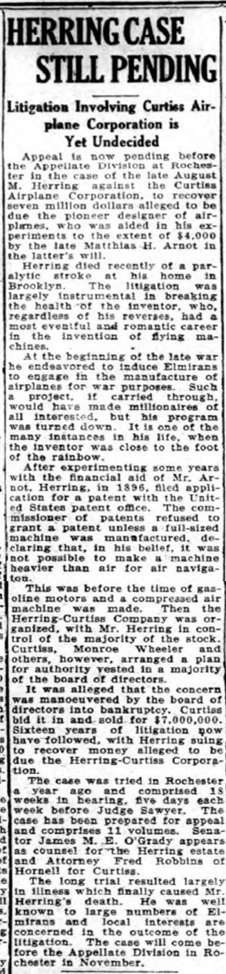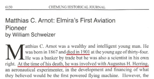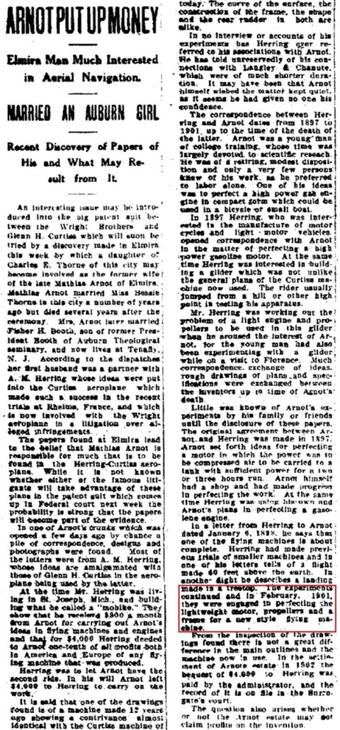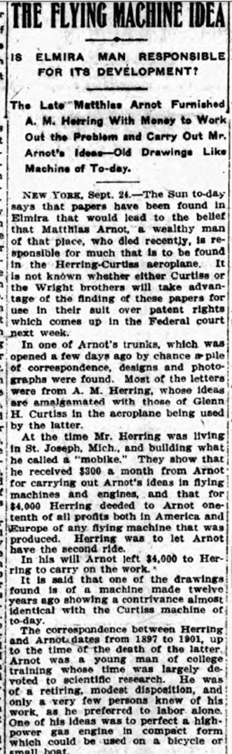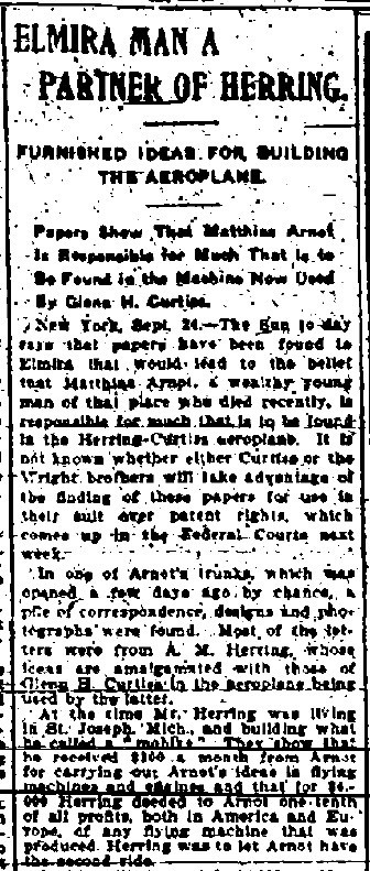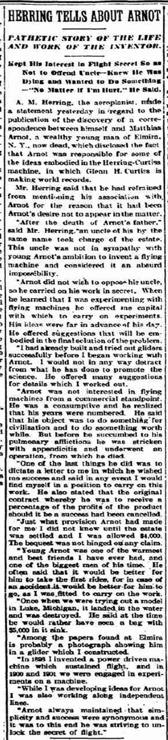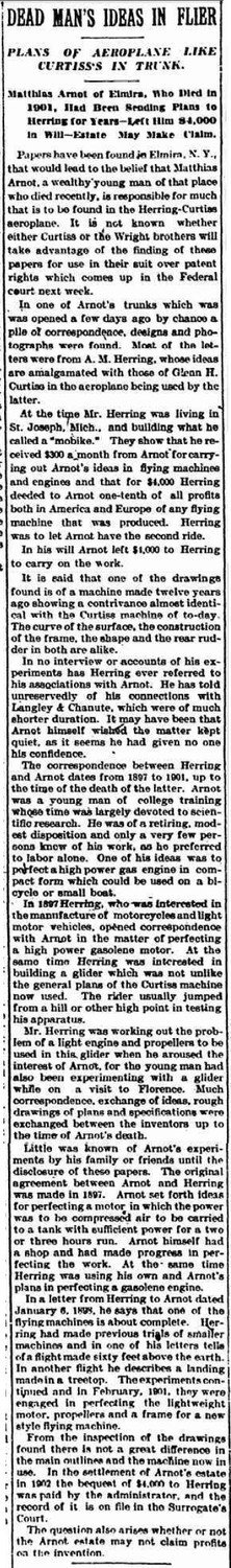"[Arnot] was a partner of A.M. Herring whose ideas were put into the Curtiss-aeroplane which made such a success at the recent trials in Rheims, France, and which is now involved with the Wright aeroplane in a litigation over alleged infringements.