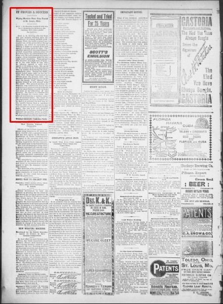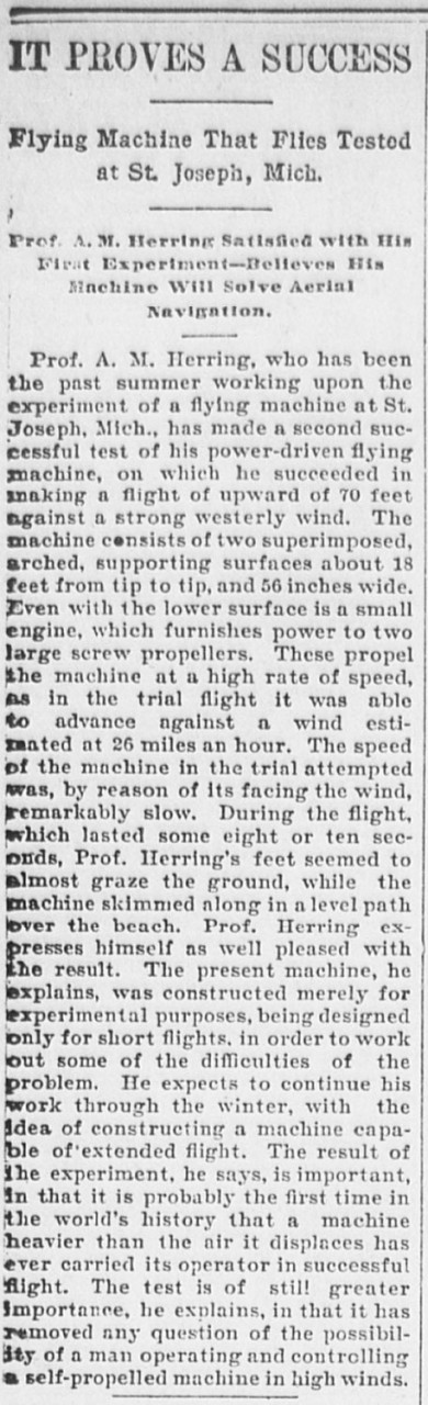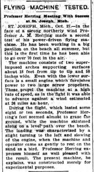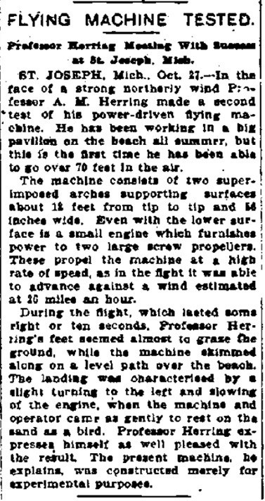 "...A.M.Herring made a second test of his power-driven flying machine [ ] the first time he has been able to go over 70 feet in the air."