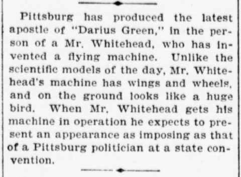 More machines were made there, but Whitehead could not make them fly. From Buffalo he went to Pittsburg, Pa., where he kept on working and trying. He made a machine in Pittsburg which, as he says,