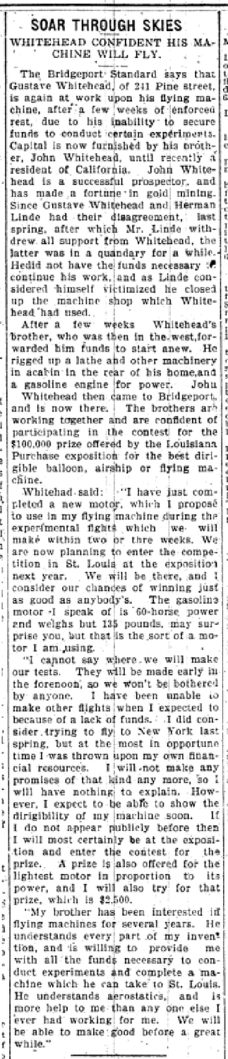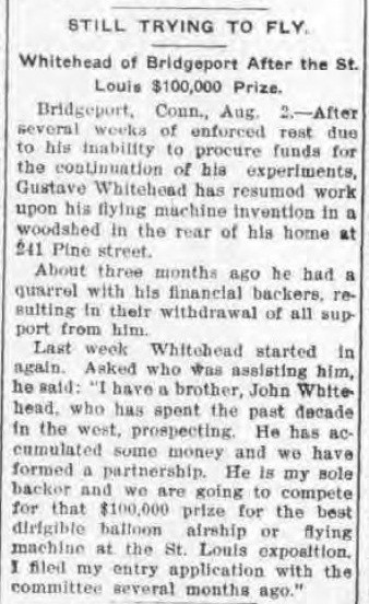 "Gustave Whitehead of 241 Pine Street is again at work on his flying machine after a few weeks of enforced rest due to his inability to secure funds to perform certain experiments. Capital is now furnished by his brother, John Whitehead, until recently a resident of California. John is a successful prospector and has made a fortune in gold mining.