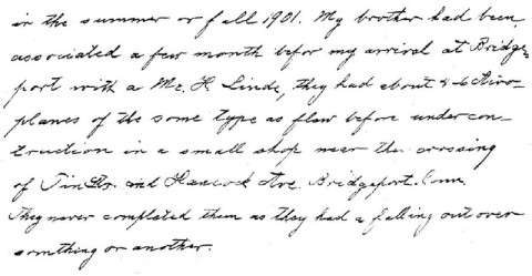 "My brother had been associated a few months before my arrival at Bridgeport with a Mr. Linde, they had about 4-6 aeroplanes of the same type that flew before under construction in a small shop near the crossing of Fine St. and Hancock Ave., Bridgeport, Conn.. They never completed them as they had a falling out over something or another."