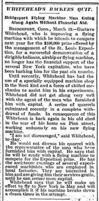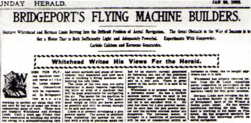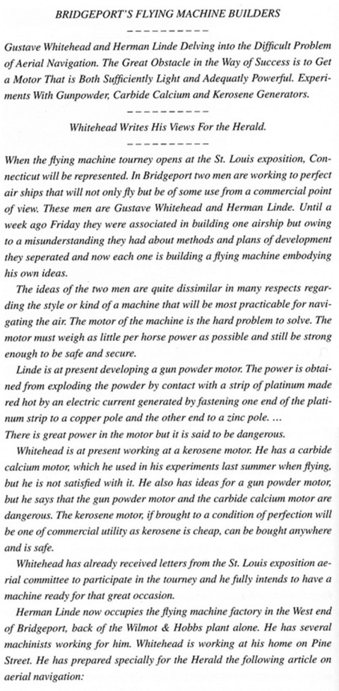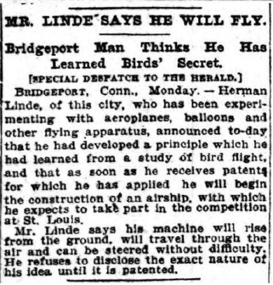 "In Bridgeport, two men are working to perfect air ships. [ ] Until a week ago Friday they were associated [ ] but owing to a misunderstanding [ ] they separated and now each one is building a flying machine embodying his own ideas. [ ] Hermann Linde now occupies the flying machine factory in the West end of Bridgeport. [ ] Whitehead is working at his home on Pine Street."