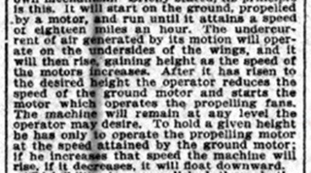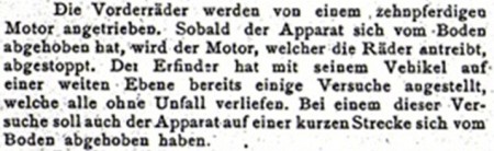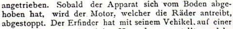 "The front wheels are driven by a 10 horsepower motor. As soon as the machine has lifted itself off the ground, the motor driving the wheels is stopped."