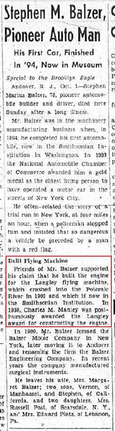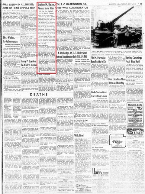 Obituary of Stephen Balzer, Brooklyn Daily Eagle, Oct. 1, 1940