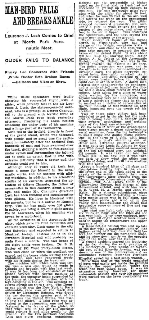 Sixteen year old Lawrence J. Lesh was the first to try [ ]. The craft he brought to Morris Park was a biplane hang glider with a twenty foot wingspan.