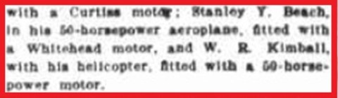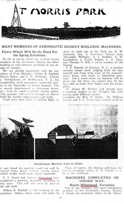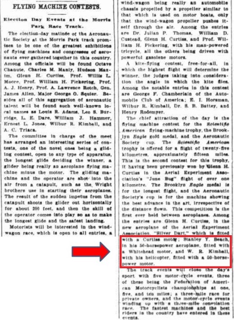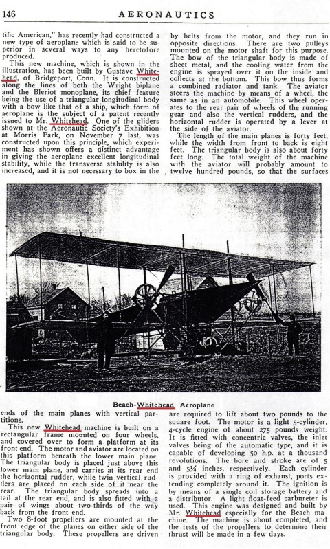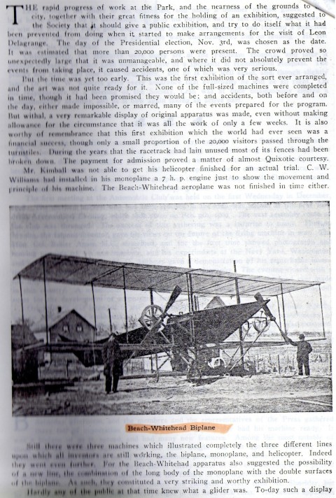 "The Beach-Whtehead aeroplane was not finished in time either. [T]he Beach-Whitehead apparatus also suggested the possibility of a new line of combination of the long body of the monoplane with the double surfaces of the biplane."
