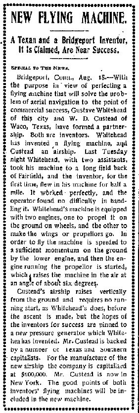 Bridgeport, Conn., Aug. I8 — With the purpose in view of perfecting a flying machine that will solve the problem of aerial navigation to the point of commercial success, Gustave Whitehead of this city and W. D. Custead of Waco, Texas, have formed a partnership. Both are inventors. Whitehead has invented a flying machine, and Custead an airship. Last Tuesday night Whitehead, with two assistants, took his machine to a long field back of Fairfield, and the inventor for the first time, flew in his machine for half a mile. It worked perfectly, and the operator found no difficulty in handling it. Whitehead's machine is equipped with two engines, one to propel it on the ground on wheels, and the other to make the wings or propellers go. In order to fly the machine is speeded to a sufficient momentum on the ground by the lower engine, and then the engine running the propellor is started, which raises the machine in the air at an angle of about six degrees,.