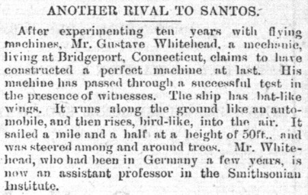 "Mr. Gustave Whitehead, a mechanic living at Bridgeport, Connecticut, claims to have constructed a perfect machine at last. His machine has passed through a successful test in the presence of witnesses."