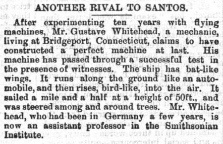 "Mr. Gustave Whitehead, a mechanic living at Bridgeport, Connecticut, claims to have constructed a perfect machine at last. His machine has passed through a successful test in the presence of witnesses."