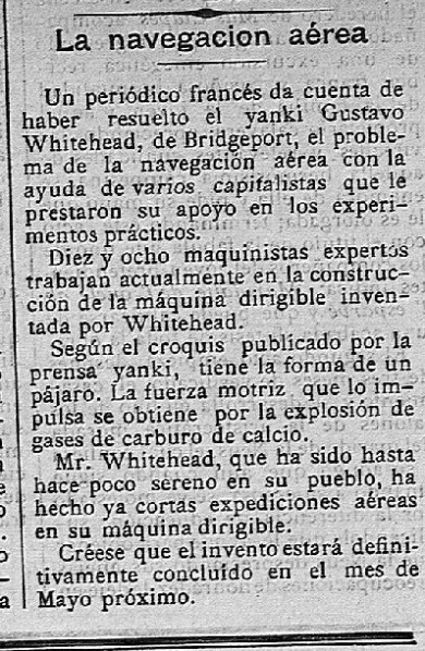 A French newspaper reports that the Yankee, Gustave Whitehead, of Bridgeport, has solved the problem of aerial navigation with
