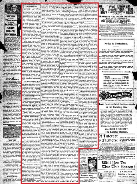 To strike the trees meant destruction to the airship and probably death to its solitary passenger. But neither happened. Whitehead suddenly remembered how birds slanted their wings to turn and instinctively he turned to one side. This careened the ship and she turned her nose away and glided around them as prettily as a steam yacht answers her helm. This gave Whitehead confidence and he looked back and waved his arms. He had now soared through the air for more than half a mile and, satisfied with what be had accomplished, shut off the power.