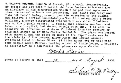I, MARTIN DEVINE, 2123 Ward Street, Pittsburgh, Pennsylvania, do depose and say that I recall the late Gustave Whitehead and an airplane of his construction which I helped push upon more than one occasion for a demonstration. The plane was heavy and I do not recall being present upon the occasion of its flight but believe I arrived immediately after it crashed into a brick building, a newly constructed apartment house which I believe was on the O'Neale estate. I recall that someone was hurt and taken to a hospital, but do not recall what one. I am able to identify the inventor as Gustave Whitehead from the picture of this man showed me by Miss Stella Randolph. The plane was heated with charcoal and the place of most of the experiments was in the vicinity of the present McKee Place and Louisa Avenue. Whithead lived on Bates Street (I think about 663 or 664) with some people named Morrow, renting part of their house, I believe. As definitely as I can recall the plane was upon wheels.