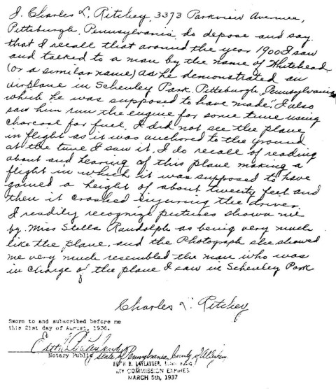 I Charles L. Ritchey, 3373 Parkview Avenue, Pittsburgh Pennsylvania do depose and say that I recall that around the year 1900 I saw and talked to a man by the name of Whitehead (or a similar name) as he demonstrated an airplane in Schenley Park, Pittsburgh, Pennsylvania, which he was supposed to have made. I also saw him run the engine for some time using charcoal for fuel. I did not see the plane in flight as it was anchored to the ground at the time I saw it. I do recall of reading about and hearing of this plane making a flight in which it was supposed to have gained a height of about twenty feet and then it crashed, injuring the driver. I readily recognized pictures shown me by Miss Stella Randolph as being very much like the plane and the photograph she showed me very much resembled the man who was in charge of the plane I saw in Schenley Park.