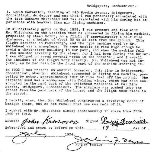 I, LOUIS DARVARICH, residing at 845 Wording Avenue, Bridgeport, Connecticut, do depose and say that I was personally associated with the late Gustave Whitehead and was associated with him during his experiments with heavier than air flying machines.