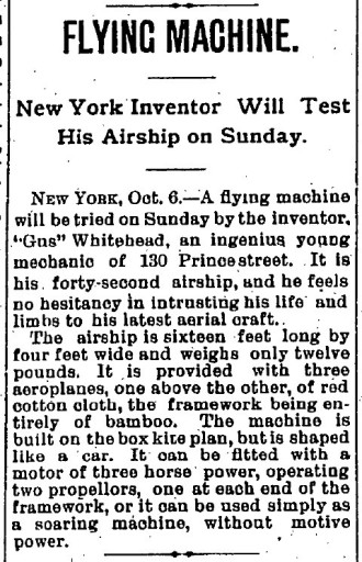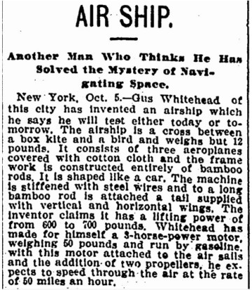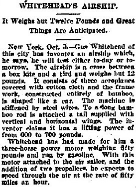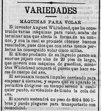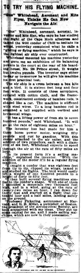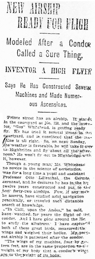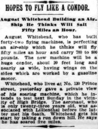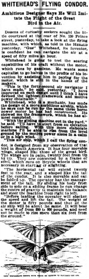 The inventor, August Whitehead, who has built several flying machines, has just finished one which imitates the shape of a condor, and which promises good results. He says that with other, less perfect machines, he has managed to fly five miles.