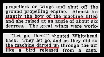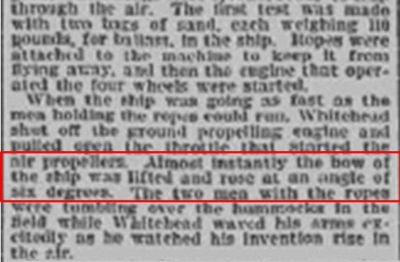 By tightening the wing-fabric just prior to rotation, Whitehead caused his aircraft to "shoot into the air".