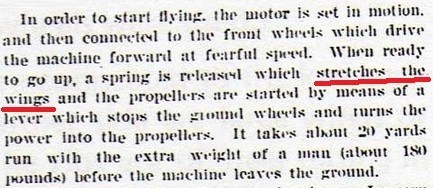 Whitehead repeatedly described this feature, "wing surface stretching", to journalists who, unable to comprehend it, regularly reported it wrongly, i.e. as "wing extension" or "wing expansion". Only in the article Whitehead himself authored on the cover of the April 1902 issue of American Inventor is it described comprehensibly.