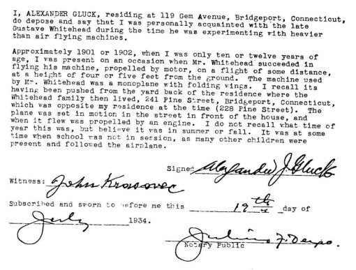 I, Alexander Gluck, residing at 119 Gem Avenue, Bridgeport, Connecticut, do depose and say that I was personally acquainted with the late Gustave Whitehead during the