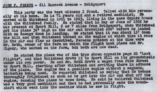 John F. Fekete, machinist, 611 Hancock Ave., Bridgeport, Ct., lived in the same building as Whitehead and worked with him in the years 1901 and 1903. In May or June of 1901 he says he was present at Sport Hill, 6 or 7 miles from Bridgeport, when Whitehead got his plane 30 feet into the air and traveled 200 feet before landing without damage. The flight started with a downhill run of about 15 feet. Whitehead then turned on the engine whereupon it rose as described. Two others were present; Mr. Roth owner of the farm where the flight took place, and Mr. Cignay who worked on the farm. Fekete had left Bridgeport with Mr. Roth in a car about the same time Whitehead left in the plane however the plane drove more slowly and took longer to arrive. The engine used gasoline, had no magnetos but did have a battery. Fekete had personal knowledge of Whitehead having himself made the crankshaft used in the engine and considered Whitehead to be a good machinist.