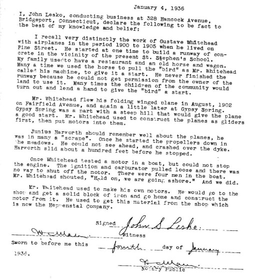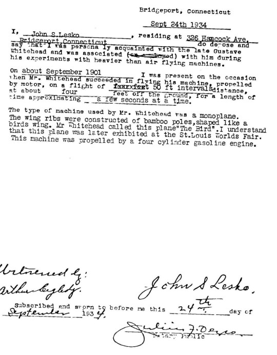 On about September 1901 I was present on the occasion when Mr. Whitehead succeeded in flying his machine, propelled by motor, on a flight of 50 ft intervals distance, at about four