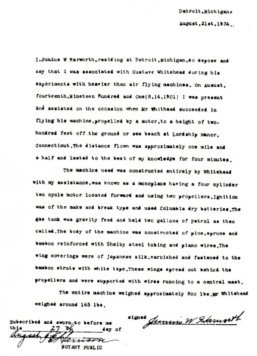 I, Junius W. Harworth, residing at Detroit, Michigan do depose and say that I was associated with Gustave Whitehead during his