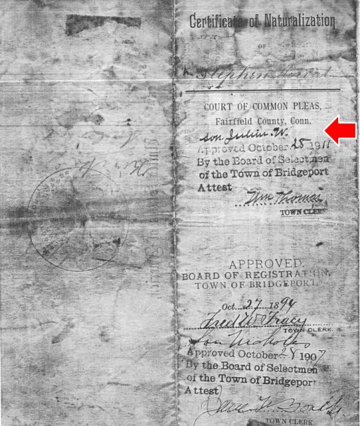 According to the blogger, “he [Julius] lied about being a naturalized citizen” on his WWI draft card (Carroll F. Gray, “Wandering Diogenes” ). However, according to the naturalization papers of my great grandfather, Stephen Horvath, his sons, Nicholas and Julius, received what’s commonly known as “derivative citizenship” from their father because they were both minors when Stephen became a citizen. The following is the front and back of the citizenship document (in the possession of my cousin, Philip Moore):