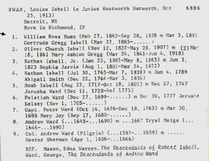 Julius’s wife, Louise, joined the organization, “Sons and Daughters…” as well as several other organizations for colonial descendants. She was fully qualified to join these groups based on her own family’s heritage. She didn’t need her husband’s participation. On her mother’s side, she was a ninth generation descendent of the Pilgrim Andrew Ward, founder of Wethersfield and Stamford, Connecticut and among the first residents of Fairfield, Connecticut. He arrived in Watertown, Massachusetts in 1633 with William Bradford. This excerpt is from Sixteen Hundred Lines to the Pilgrims Lineage, Book III, Genealogical Publishing Company, Middlebury, Connecticut, 1982, 30: