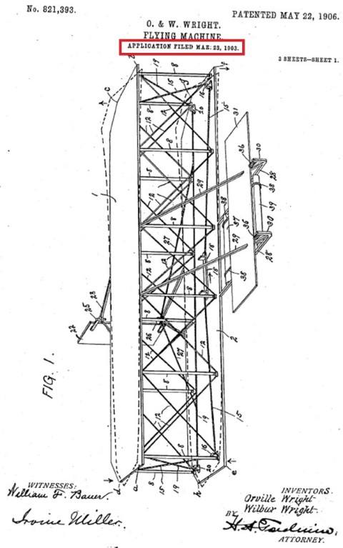 Wright Patent, applied for, March 23, 1903 (almost 4 months after Whitehead published wing-warping system in 'Aeronautical World', Dec., 1902)