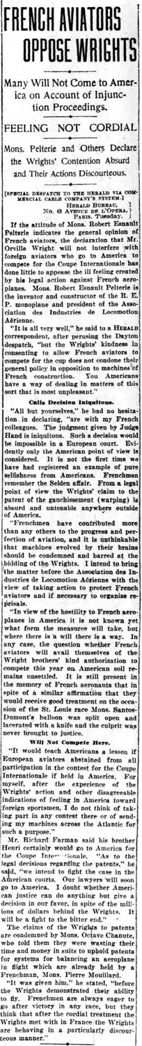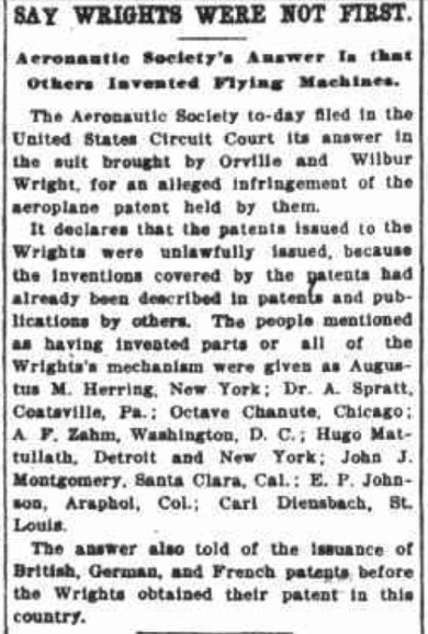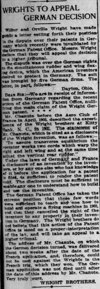 The article below gives an interesting perspective on the Wright patent issue. Having found a regional US judge sympathetic to their claims, the Wrights asserted