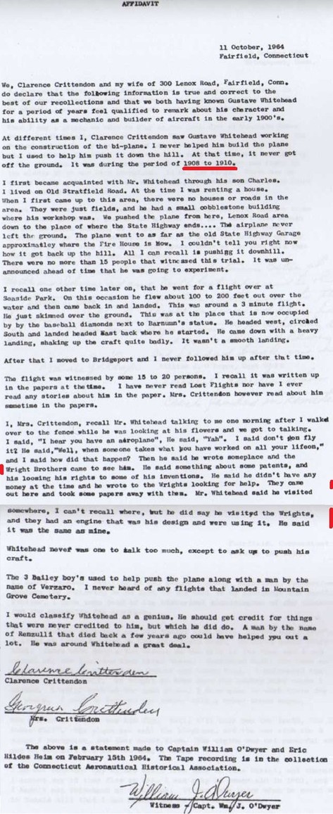 "...the Wright brothers visited Mr. Whitehead during the early 1900's, coming from Ohio and under the guise of offering to help finance his inventions, actually received inside information that aided them materially in completing their own plane. I was at the shop with him when they arrived and waited outside while they talked inside. After they had gone away, Mr. Whitehead turned to me and said, "Now since I have given them the secrets of my invention they will probably never do anything in the way of financing me", this proving to have been a true prophecy.