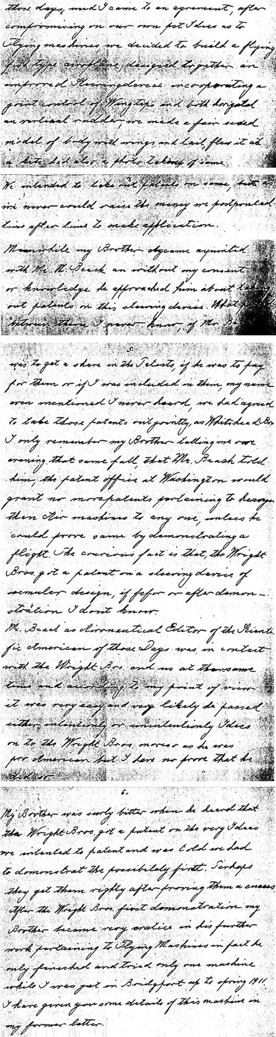 "Mr. Beach, as Aeronautical Editor of Scientific American of those Days, was in contact with the Wright Bro. and according to my point of view it was very easy and very likely he passed either intentionally or unintentionally Ideas onto the Wright Bros., moreso as he was pro American but I have no prove that he did so. My brother was surely bitter when he heard that the Wright Bros. got a patent on the very I deas we intented to patent and was told we had to demonstrate the possibility first."